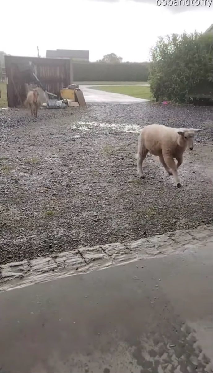 2. 突然雨に放牧中のヒツジとポニーに避難を呼びかける飼い主さん。みんなすぐに厩舎へ帰るいい子です【海外・動画】