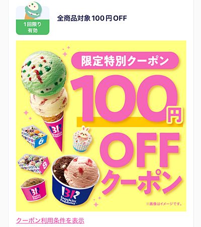 そんな今、サーティワン公式アプリ「31Club」ではなんと、好きなメニューどれでも100円オフになるクーポンが出ています。