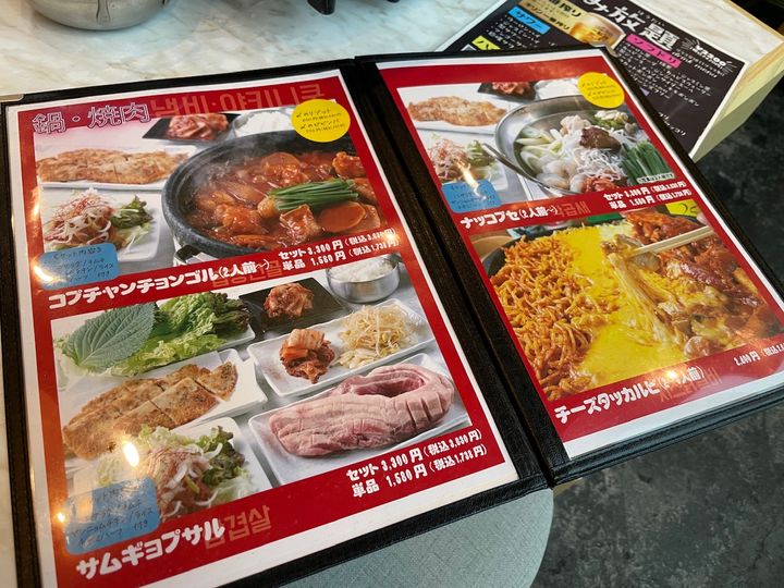 セットメニューが用意されていて、メインとなるコプチャンチョンゴル、サムギョプサルなどを選んだら、あとはチヂミなどの小皿料理がついてきます。 悩んだときは、セットにするといろいろ食べられていいなと思いました。もちろん単品で好きなものを組み合わせていくこともできます。