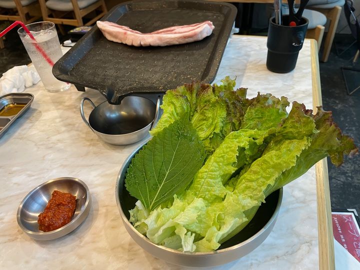 店員さんが目の前で焼いたり切ったりしてくれました。 鉄板の手前では、もやしとキムチ、ニンニクも焼きます。なるほど、豚肉の油を吸っていい感じの味になるのですね。葉っぱに包んでいただきました。 焼肉屋さんなどでいただくのとはまた違う本格的な味わいで、これが本物の(?)サムギョプサルかー!となりました。