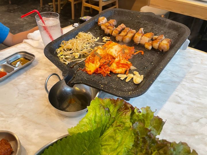 子どもも一緒だったので、辛くなく食べやすいものということで、まずはサムギョプサルをいただきました。 コンロの上に、斜めになった鉄板を乗せて焼きます。本格的な韓国料理屋さんに行ったことがなく、初めて見ました。この形だと、余分な油が落とせていいですね。