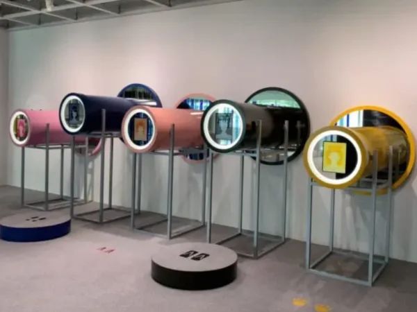 チューブの中をのぞくと、様々なメイクパターンが自分の顔に重なり、メイク体験ができます。