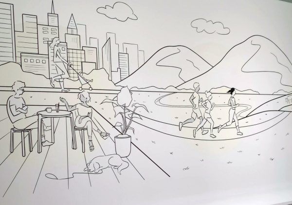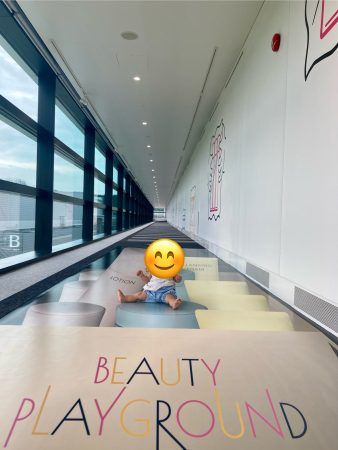 「ビューティー ウォーク」と呼ばれる体験型施設へ続く道はとてもユニークで、ベルトコンベアの化粧品になったような気分になれちゃいます。壁面には製品が完成するまでの道のりが描かれています。トリックアートもあるのでこんな写真も撮れちゃいますよ。