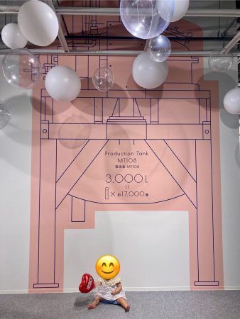製造エリアにある実際のマシンが原寸大で壁面に表示されていました。並んで写真を撮ってみると大きさにびっくりですね。風船を持って記念撮影も。