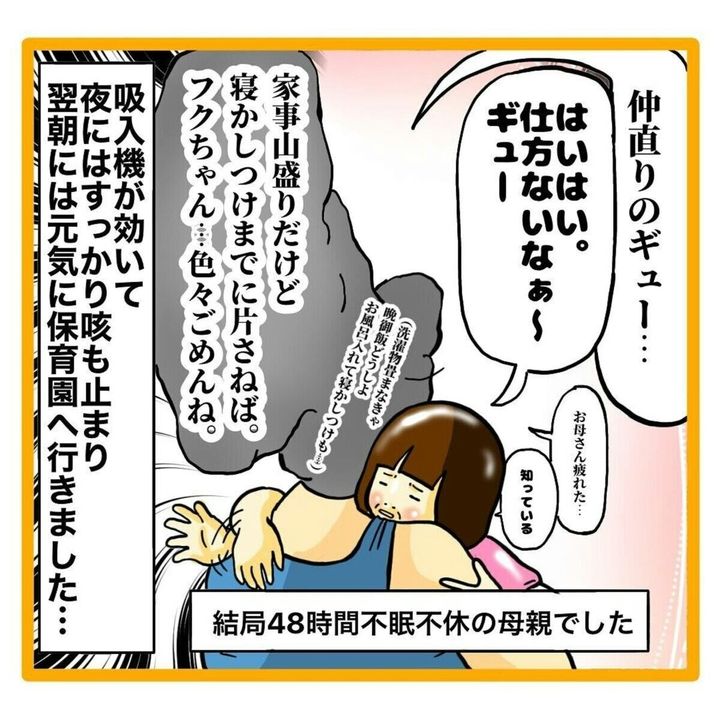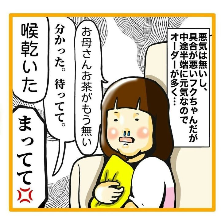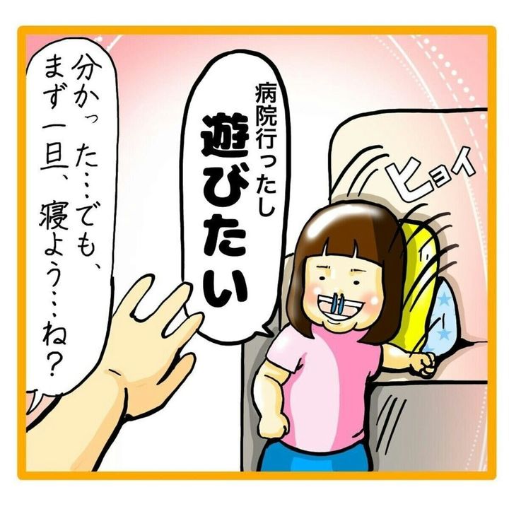 皆さんはわが子の看病でどんな苦労をしたことがありますか?体調が心配なのはもちろんですが、なかなか自分の休息の時間を取ることができず、つらい思いをした人もいるでしょう。今回ご紹介する作品は、へー子(@fuku.fuku.pro)さんが長女、フクちゃんを看病するエピソードです。ついイライラしてしまう看病中の日々に思わず共感してしまうでしょう。インスタグラムで連載をした『風邪をひいた長女を怒鳴った日』をご紹介します。どうぞご覧ください。