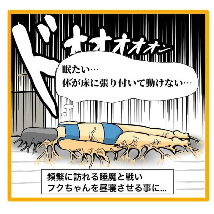 自分もすっかり寝不足ですが、一晩中フクちゃんに付き合うへー子さん。朝までに回復してくれればよいのですが、難しいよう…。こうして看病の日々が始まります。