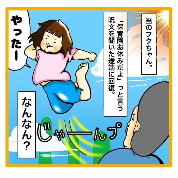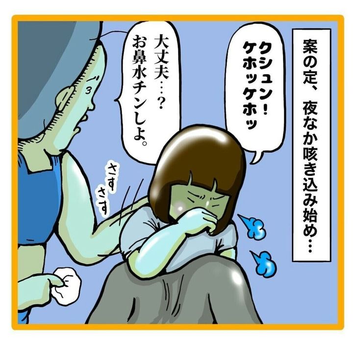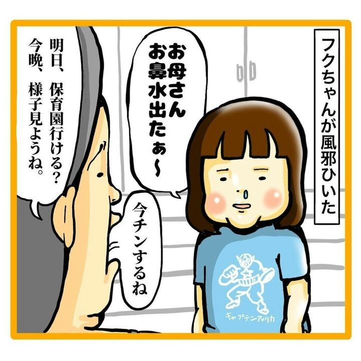 ある日、へー子さんの長女、フクちゃんが体調不良になってしまいます。鼻水やせきがあり、夜も寝苦しい様子です。熱はないですが、このままでは保育園を休ませようと思うへー子さん。