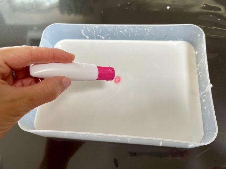 片栗粉と水を混ぜた状態に、絵の具を足してもキレイになじむ事ができませんでした。