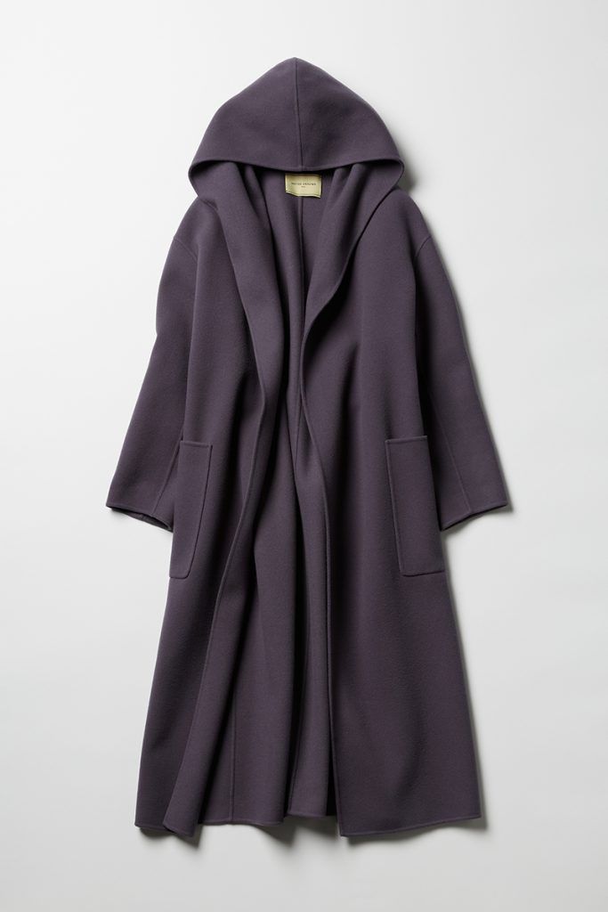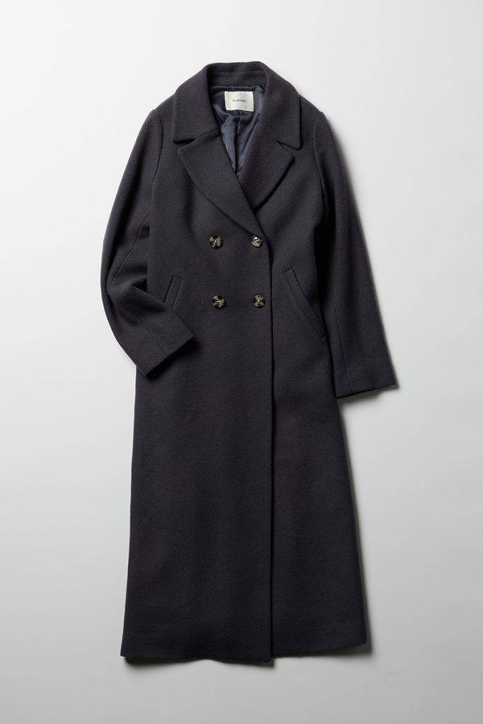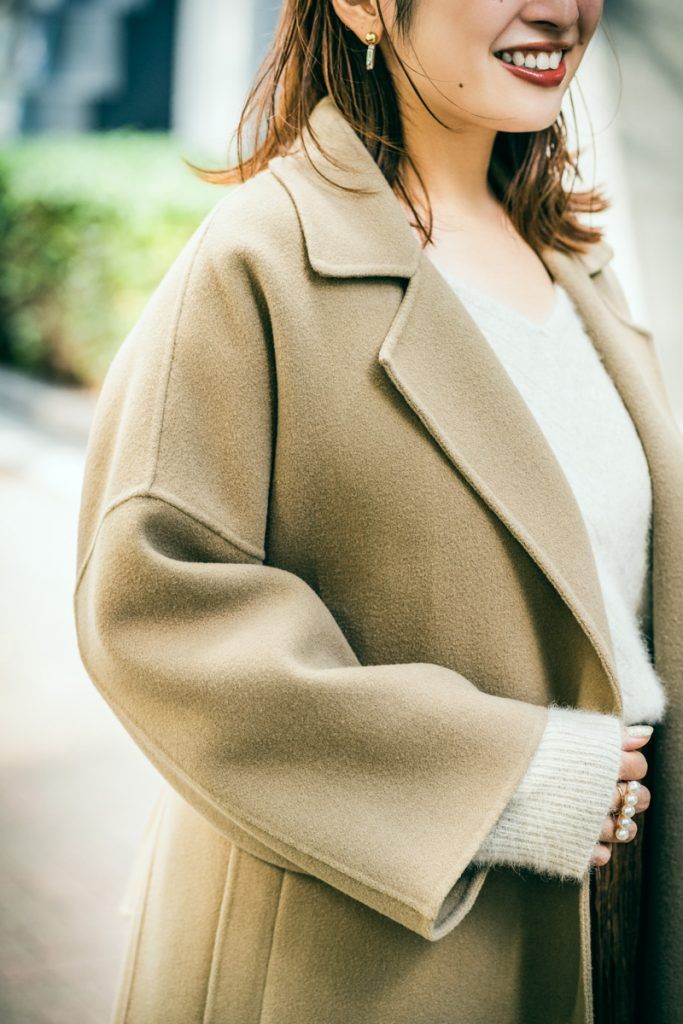 生地が温かいのに薄くて滑らかさと落ち感がとにかく極上なコート。肩周りもさりげないドロップショルダーでストンと落ちて体にフィットするのでシルエットが広がって見えません。さらに高めのウエストベルト位置でコートを閉じた時もすらっと脚長に見せてくれます。