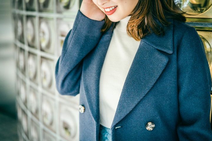 ふっくら保温効果の高い素材を使用。ボタンを閉じるとウエストがキュッとくびれるシルエットになります。ネイビー異素材コート¥25,000(アンデミュウ/アダストリア)