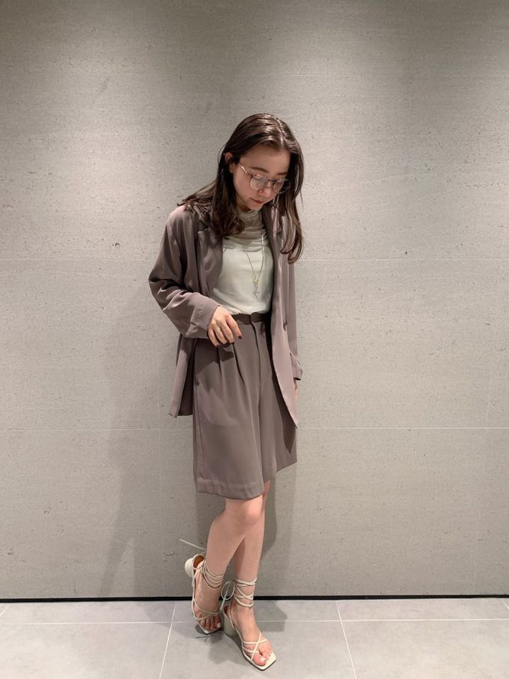 「ロングパンツのセットアップに比べて肌見せできるので、Sサイズでもすっきり着こなせてオススメです。つま先まで見えるヌーディサンダルを合わせて、さらに脚長効果を意識することがポイント。メガネやネックレスなど、顔周りに小物を合わせて視線を上に集めることで、背を高くバランスよく見せられます」