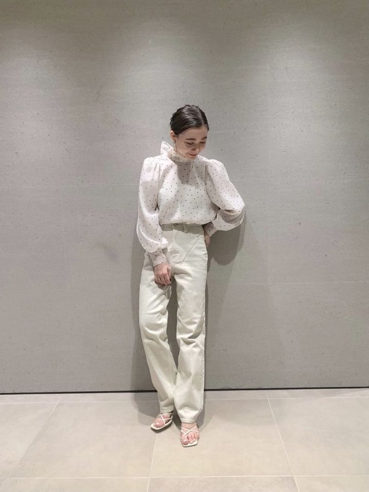 「ハイネックでボリュームのあるブラウスですが、ハイウエストデニムを合わせて腰位置が高く見えるようにすると背が低くてもバランスよく着こなせます。ブラウス自体も、透け感のある生地を選ぶと軽やかでオススメです。ワントーンですっきり見せつつ、トップスの柄でアクセントを加えました」