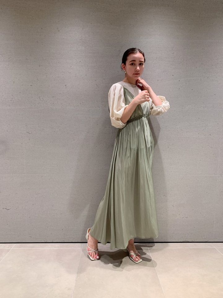 「トレンドのロングキャミワンピは、ボリュームもある分Sサイズの人は躊躇してしまいがちですが、ハイウエスト切替のものでしたらグッとスタイルアップ。さらに足の甲が見えるサンダルを合わせることで、足元が重たくならないようにすると背を高く見せられます。アップヘアにするのもバランスよく見せるポイントです」