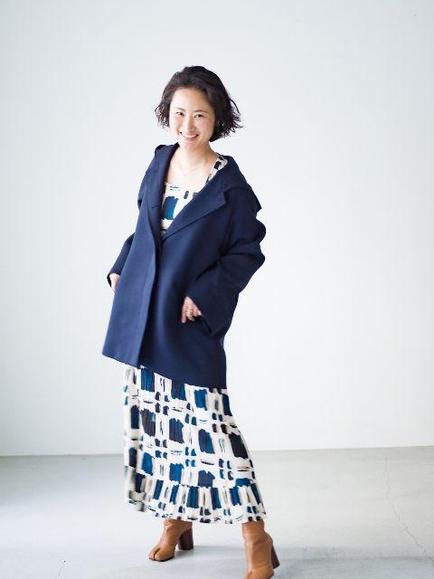 身長がないと映えない大きめの柄も、選び方と着こなし方でSサイズでもバランスよく着られます。「Sサイズの人が大きめの柄ワンピを選ぶなら、幾何学柄で目を錯覚させてくれるもの、そしてハンドで描いたような抜け感のある柄を選ぶのがオススメ。そして、柄の中で引き締め効果のある色を拾ったアウターを羽織って締めるとすっきり着こなせます。」