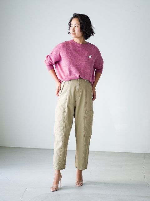 Sサイズのパンツ選びのポイントは、ハイウエストが鍵。「ハイウエストボトムスは、Sサイズがバランスよく見せるための強い味方です。パンツをナチュラルカラーにして、トップスは明るい色ものを合わせると目線が上にいってスタイルアップできます。さらにブローチをつけるのもポイント。トップスはインして、少しでもコンパクトに仕上げます。足首や手首を見せて、抜け感を出すのもすっきりしてオススメです」