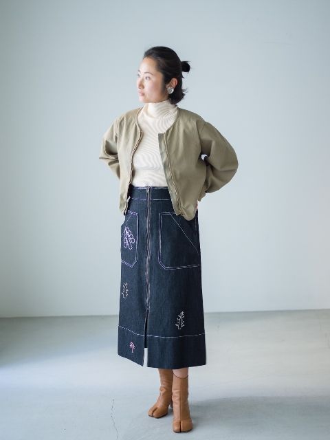Sサイズの人が下半身にボリュームを持たせたコーディネートをするときには…「ボリュームが出てしまうミディ丈のスカートを選ぶときは、スリットが入っていたり縦のラインを出してくれるデザインが正解です。刺繍も、目線が散らばってボリューム感が分散されます。丈の短いジャケットで、トップスをコンパクトにまとめるのも大事ポイント。大きめのピアスで顔回りにアクセントを加えるのもスタイルアップの秘訣です」
