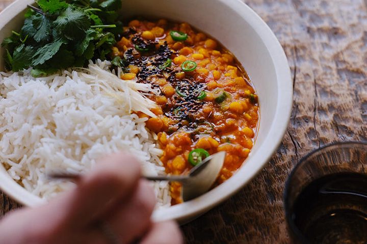 火が通りやすい皮なし豆を使ってつくる即席カレーです。豆のだしが出たゆで汁も使うことで、肉なしでも濃厚な味わいに。豆は小粒のものを数種類混ぜて使うと、味に深みが出ます。料理ユニットのオカズデザインに手軽でもちゃんとおいしく仕上がるレシピを教えてもらいました。