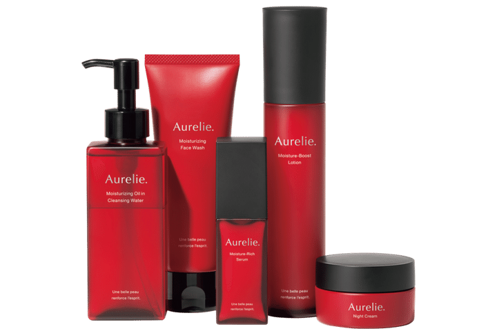 左から:モイストオイルインクレンジングウォーター 150mL ¥3,960、同 モイストフェイスウォッシュ 100g ¥3,740、同 モイスチャーリッチセラム 30mL ¥8,580、同 モイスチャーブーストローション100mL ¥3,960、同 モイストナイトクリーム 30g¥5,280(全てAurelie.)