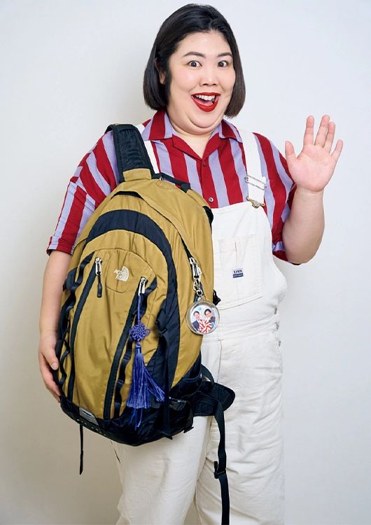 「元カレと色違いで購入した恋多き思い出のリュック。芸人仲間のシカゴ実業さんと交換した缶バッジをぶら下げて、オリジナリティを出して楽しんでます」