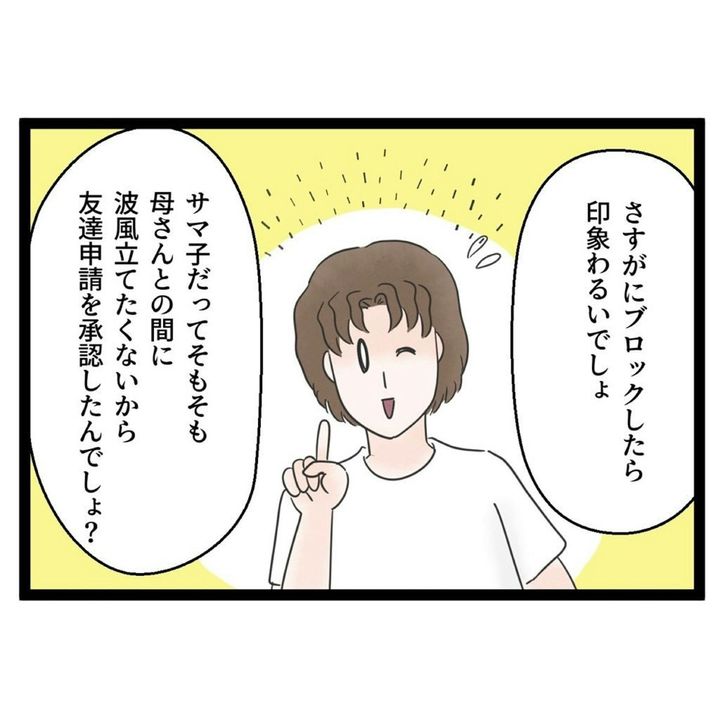 SNSを続ける上で、これ以上義母からの無神経なコメントは避けたいサマ子さん。すると夫が「閲覧制限」の機能を教えてくれました。これで、サマ子さんのストレスも解消されるのでしょうか?