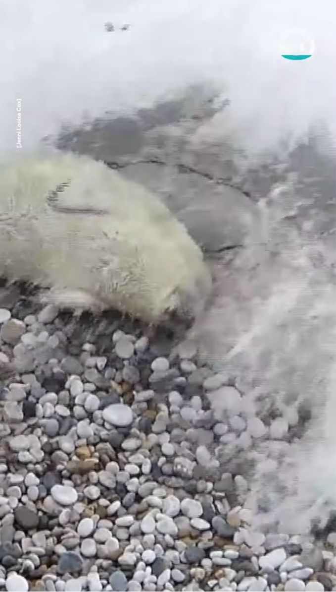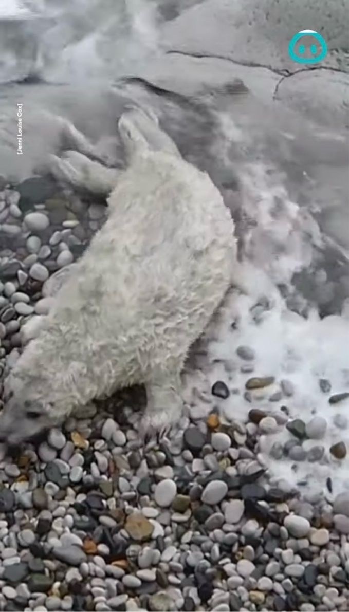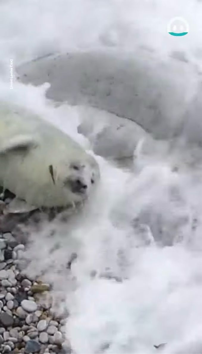 気持ちよく寝ていて波に気付いていなかったアザラシの赤ちゃん。 波を全身に浴びてしまいました!