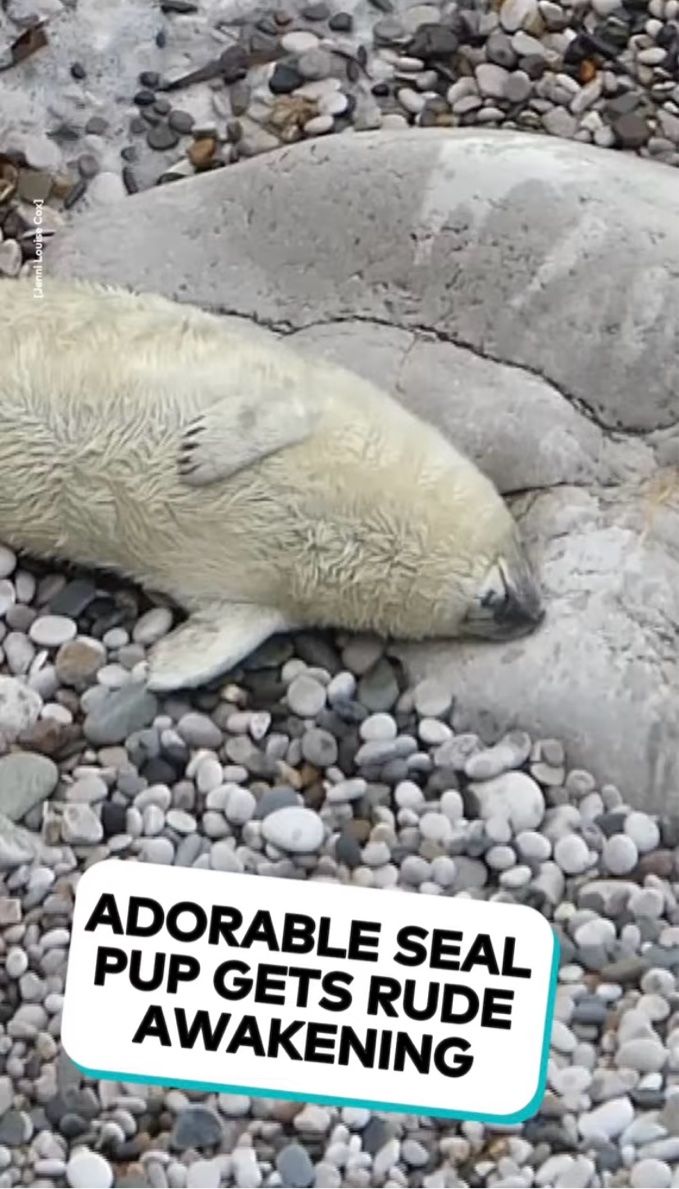 ビーチで岩を枕にしてうたた寝していたアザラシの赤ちゃん。 とてもかわいい光景でしたが・・・、この子はまさかのハプニングに驚いて飛び起きる羽目に!