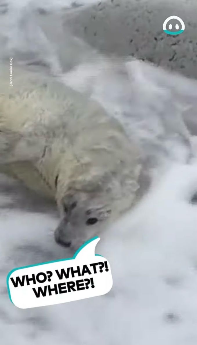 まさかの出来事に、うたた寝していたアザラシの赤ちゃんは驚いたのでしょう。 慌てた様子で飛び起きました!