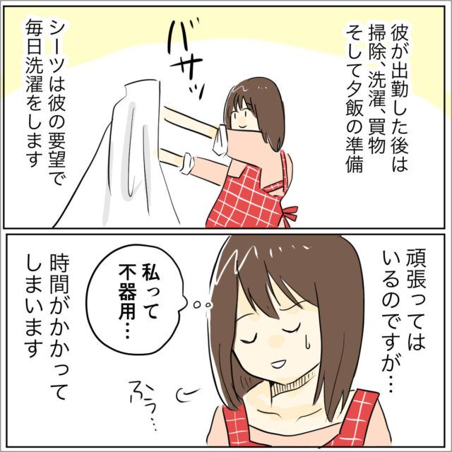 そしてタクマさんが出勤した後は、掃除、洗濯に買い物、そして夕飯の準備に、タクマさんの要望でシーツも毎日洗濯をする。それがカナコさんのルーティンになっていました。一生懸命頑張ってはいるものの、時間がかかってしまい、「私って不器用・・」とカナコさんはため息をつきました。