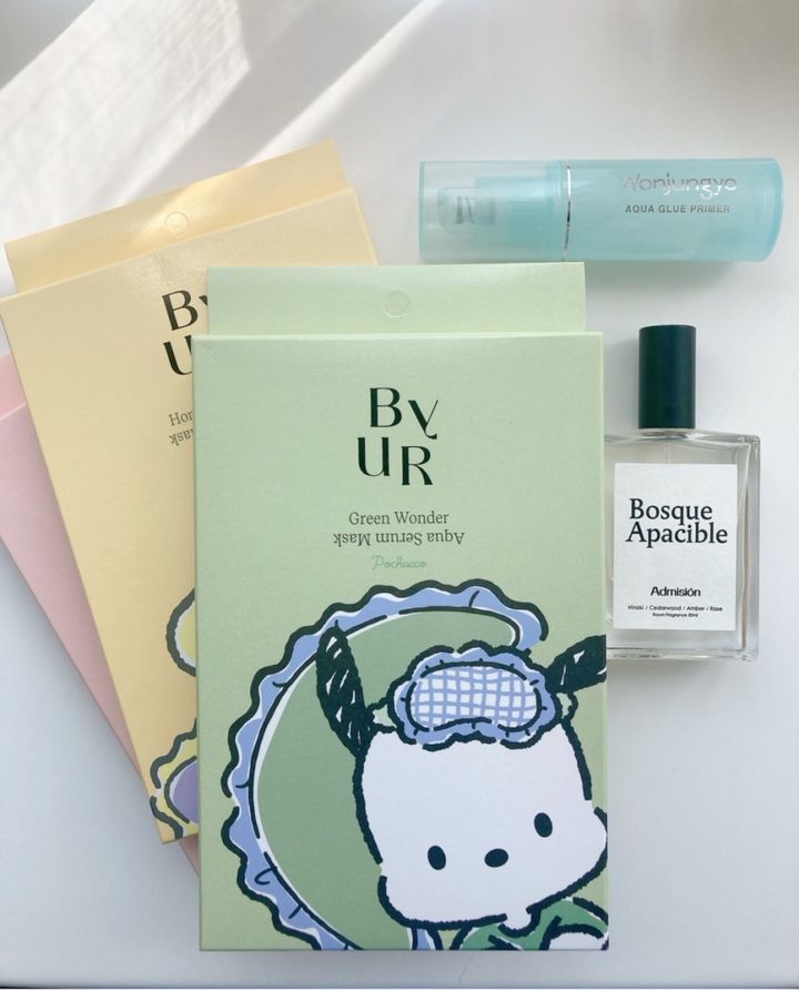「先日お招きいただいた発表会でひと目惚れ! サンリオキャラクターズのLINEスタンプのヘビーユーザーな私にとって、さいっこうのコラボです。これ考えた方、天才です。ありがとうございます♡ 真面目に中身のパックの話をすると、バイユアのアクアセラムマスクはもともとピンク、イエロー、グリーンのパッケージの3種あって、それぞれ毛穴と肌悩みによって選べるようになっているんです。ピンクはビタミンチャージ、イエローはマヌカハニーとセラミド配合で高保湿、グリーンはツボクサエキスやティーツリーエキスで角質ケアといった感じ。なので、揃えておけばその日の肌調子で使い分けできるのが便利で常に買い置きしてあるんです。シート自体は薄手なんですけど、ピタッと肌に密着するし、パック後のモッチリ感もしっかりあるし、キメも整います。1枚に約25mLも美容液が含まれているというのも納得。カットが小さめで鼻や口元にもちゃんとフィットするのもポイント高いんですよ。私の肌は乾燥気味でくすみが気になるので、ピンクを一番使いますが、夏の朝は肌がベタつくのでグリーンに自然と手が伸びます。ちなみにトナーパッドも最高なので、見つけたら買っておいてくださいね」とMちゃん。このパッケージ、我が家の10歳の娘も抱きしめて小躍りしていました。個包装にまでちゃんとイラストがプリントされているので、ちょっとしたギフトに1枚ごとに分けてお渡ししてもいいですよね。発売は8月30日。数量限定だそうなので、お見逃しなく♡