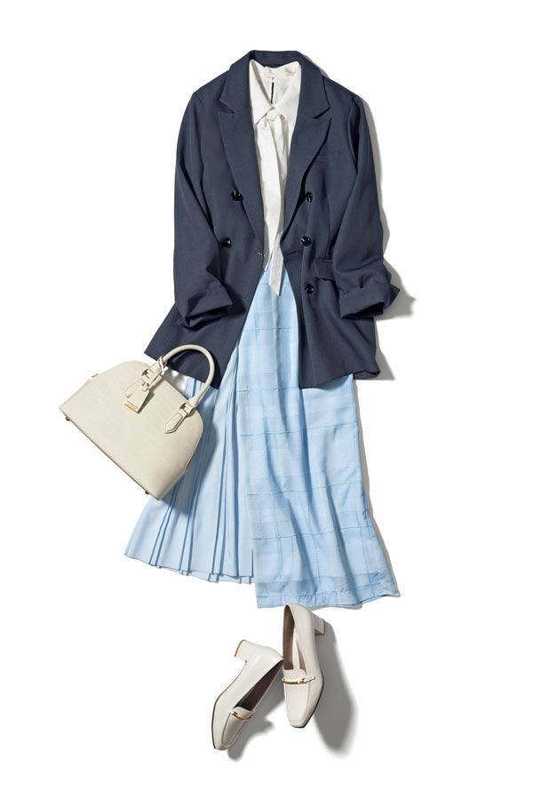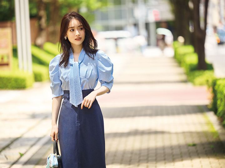通勤で着る【水色アイテム】は×ボウタイブラウスで知的さもアピールして好印象をゲット