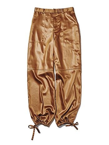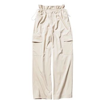 カーゴパンツ 12,650円/SeaRoomlynn しなやかなサテン素材をさらに上品に仕上げるクリーミィな白。ギャザーを配したウエストデザインは、腰の高さや腰まわりのハリ感をごまかしながら、あいまい色の間のびも防げる。