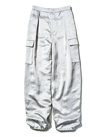 ライトグレーカーゴパンツ 29,700円/アルアバイル どう着ても上品なサテンで、旬のメンズライクなパンツを投入。ミリタリーデザインでも無骨になりすぎない、ツヤのある薄めグレーでとり入れるのがキレイな服にも合うポイント。すそのドロストを絞ればストレートにもテーパードにも調整が可能。手洗いもOK。