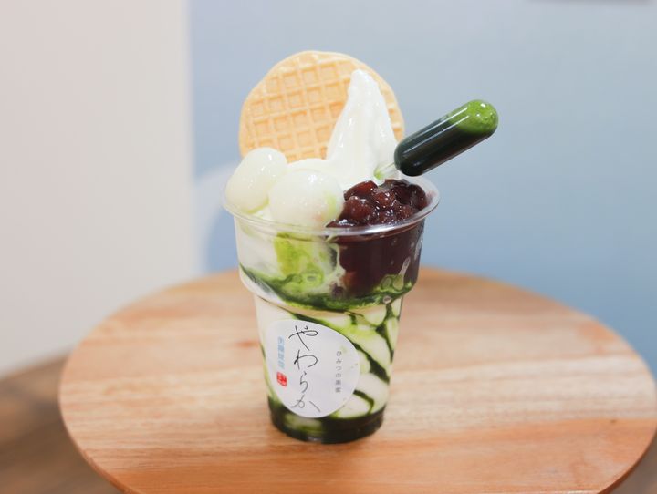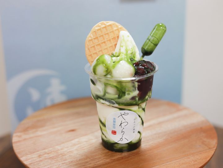 やわらかは「黒蜜きなこわらび餅」500円(税抜※以降すべて高岡店での販売価格)と「抹茶蜜白玉ぜんざい」600円という究極の2択が用意されています!店頭にはかわいいフォトスポットも設置されていますよ。