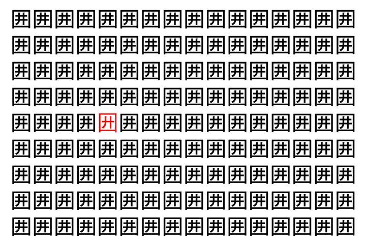 画像の中には、「囲」という漢字が縦に9行、横に16個並んでいます。 全部で144個となりますが・・・、そのうち1つは「異なる漢字」となってますよ!!