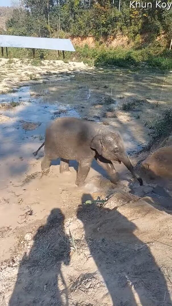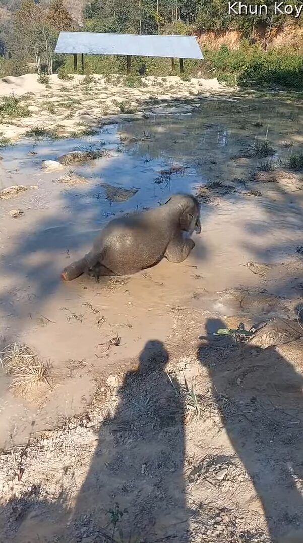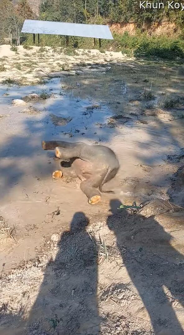 水遊びを楽しんでいるゾウの赤ちゃん。 しかし、起き上がろうとしたところで悪戦苦闘しているようです。