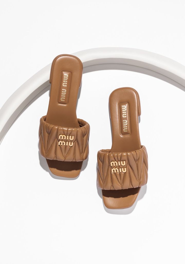 Brand: MIU MIU Item : キャメル マテラッセレザー スライドサンダル Price : ¥138,600(予定価格)