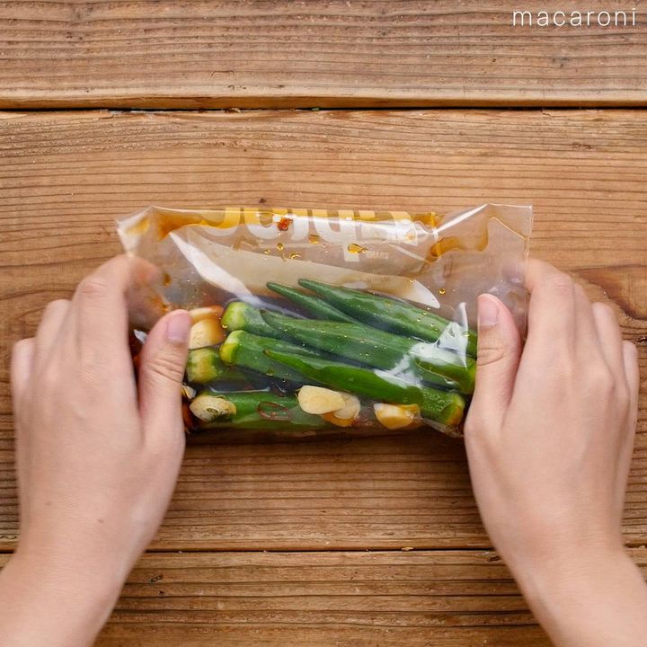 4: ジッパー付き保存袋に【調味料】、オクラを入れて揉み込み、冷蔵庫で1時間以上漬けたら完成です。