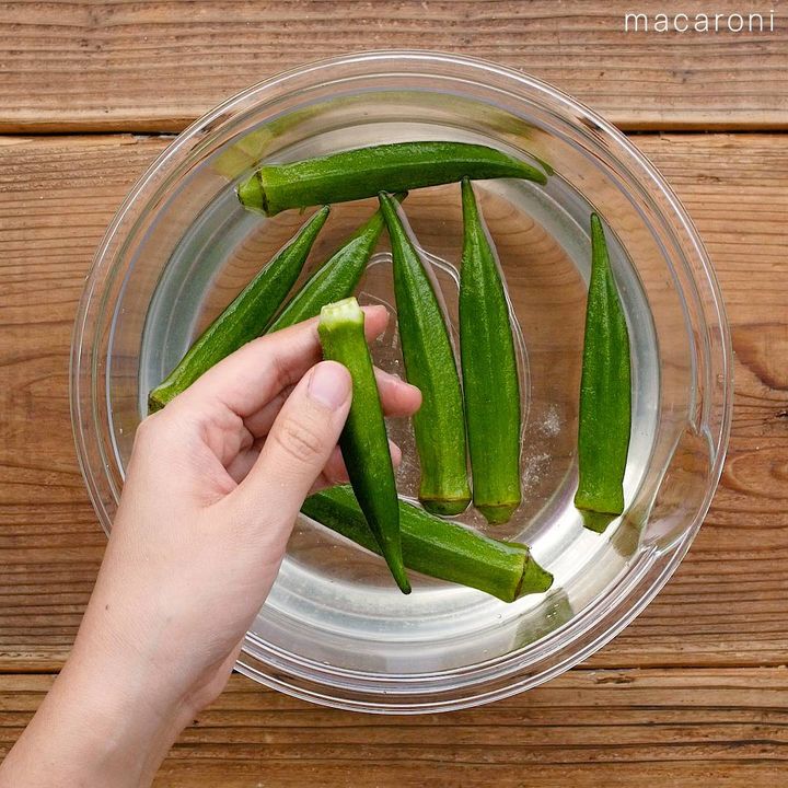 1: オクラに塩を揉み込み、水洗いしてヘタとガクを取り除きます。