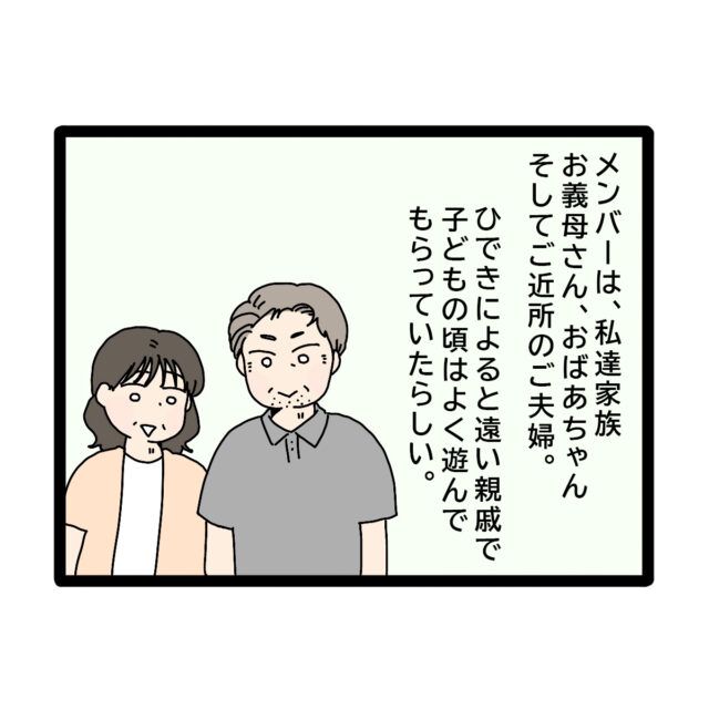 夕飯のメンバーは、お祖母ちゃん、義母、ひできさんたち家族、そして近所のご夫婦。このご夫婦はひできさんの小さい頃からをよく知る遠い親戚だそうです。