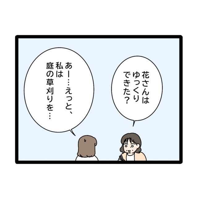 「花さんは、ゆっくりできた?」と私にも聞いてくれましたが、一日中、家事と頼まれ事で終った花さんは「あー・・・えっと、私は・・・庭の草刈りを」と少し言葉が詰まってしまいました。