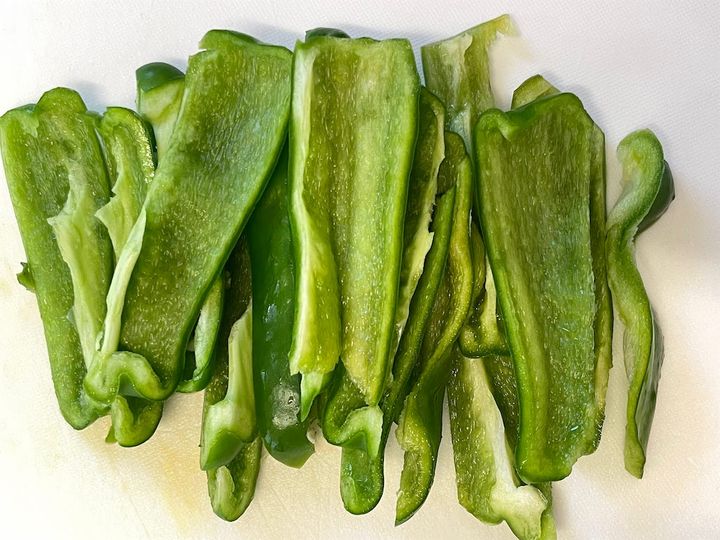 2.ピーマンは種とワタを取り、縦3~4等分に切ります。