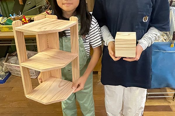 必要な部材や釘がセットされたキットがあり、組み立てるところからスタートです。貯金のできない中学生は「貯金箱」を、片付けが苦手な小学生は「便利棚」をチョイス。1時間程度でなんとか完成しました。