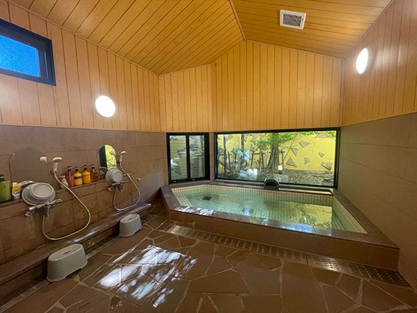 周辺散策に誘ってみるもインドア派の娘たちに断られ、チェックイン後お風呂へ直行。きれいなお庭も見えて心も身体もすっきり。