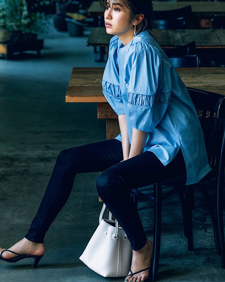 7月6日(火)、定番の「黒スキニー」を今っぽく着るなら、ボリューム袖のブラウスを合わせるのが正解。爽やかなライトブルーが、初夏のムードを盛り上げます。足元はヒールのストラップサンダルで、抜け感をプラスして。