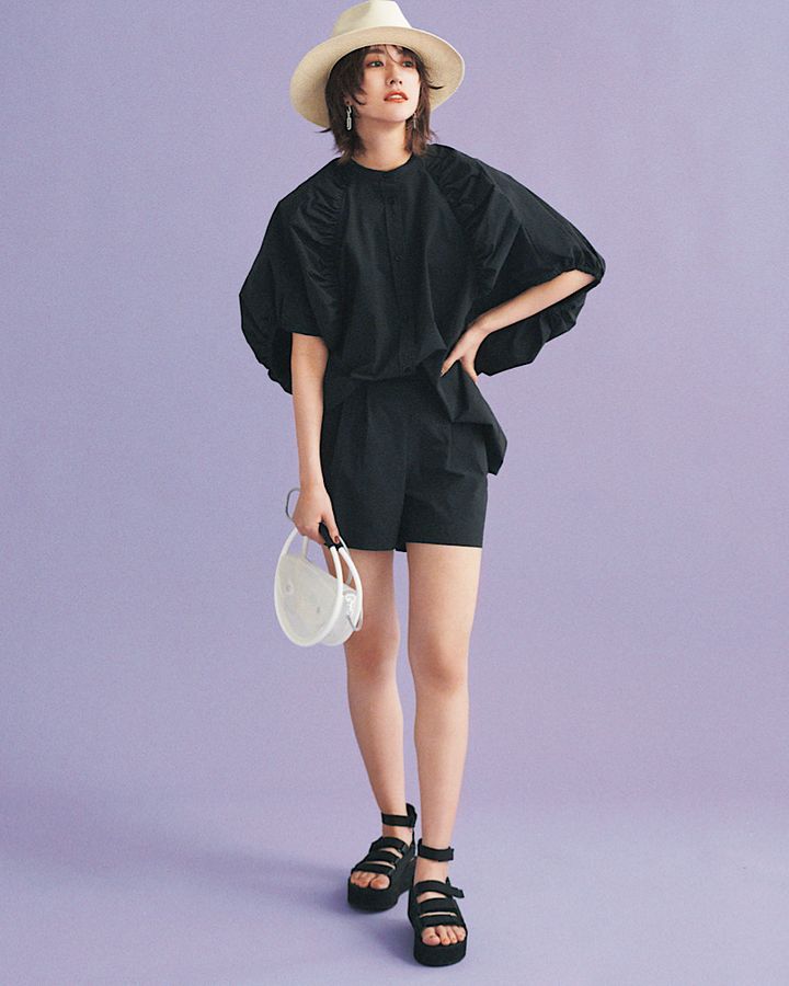 7月10日(土)、子供っぽく見えがちな「盛りブラウス」と「ショーパン」の組み合わせも、オールブラック&シャリ感素材なら問題なし。厚底デザインの「黒スポサン」で、雨の日でも快適な足元に。白のハットやバッグで抜け感を意識した、旬のモノトーンコーデです。