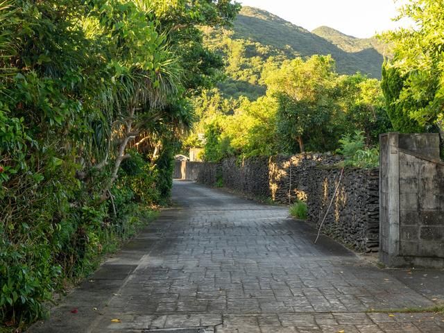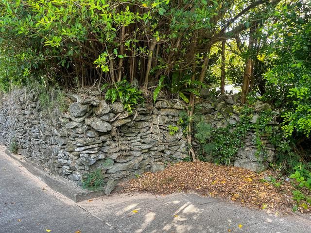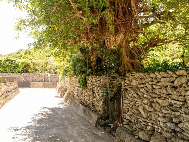 集落の中を歩くと、サンゴの石垣に囲まれた道が続きます。与路島では、堀を作るための貴重な資材としてサンゴが使われてきました。涼を呼ぶ景観として「島の宝100選」に選出されているとのこと。石垣を縫うように生えるガジュマルを眺めると、人の暮らしと自然の調和が感じられます。