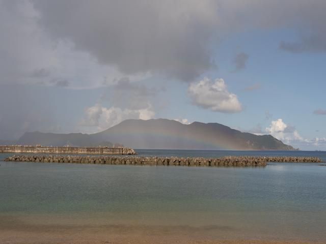 ビーチで過ごしていると、請島に雨が降り出しました。すると、不思議な虹が見え……