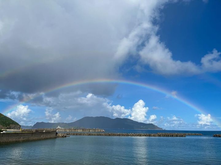 与路島にも雨がポツポツと。すると、虹はどんどん大きくなり、請島の真上に絵に描いたような虹がかかりました。しかも二重。