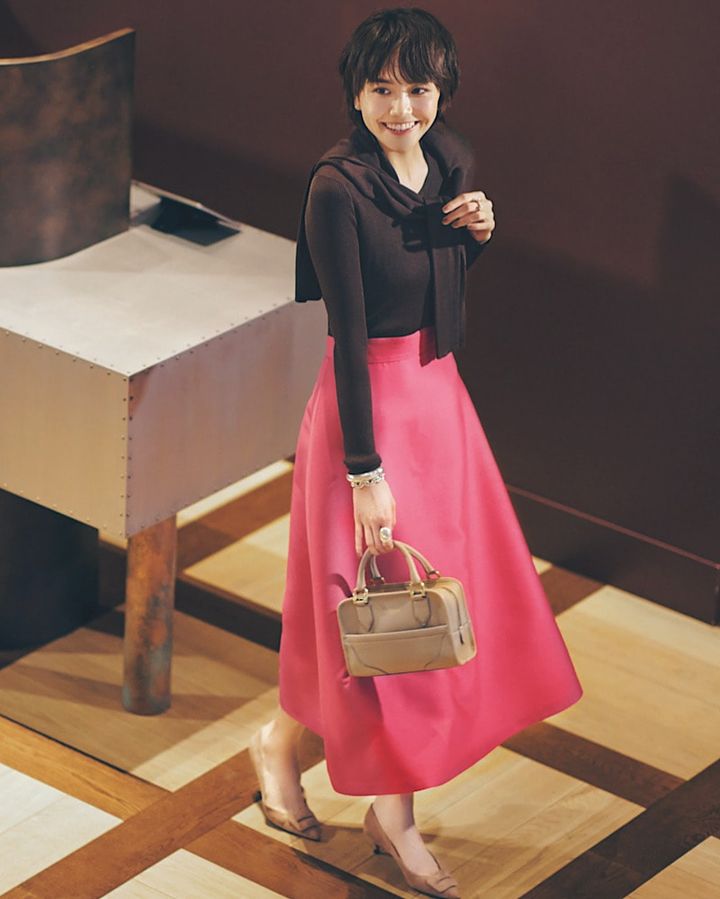 ニット¥18,700カーディガン¥20,900(ともにユナイテッドアローズ/ユナイテッドアローズ 渋谷スクランブルスクエア店)スカート¥35,200(ユナイテッドアローズ/ユナイテッドアローズ 六本木ヒルズ店)バッグ¥169,400(J&M デヴィッドソン/J&M デヴィッドソン 青山店)パンプス¥59,400(ペリーコ/アマン)チェーンブレスレット¥14,300(フィリップ・オーディベール/アルアバイル)シルバーリング¥12,100(フィリップ オーディベール/ビームス ハウス 丸の内)パールリング¥22,000 バングル¥57,200(ともにシンパシー オブ ソウル スタイル/フラッパーズ)