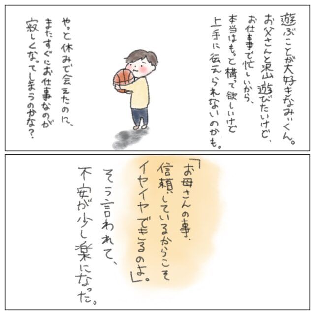 お母さんを拒否するみぃくんに悩み、信頼している保健師さんに相談したねむりひつじさん。このとき保健師さんが言ってくれた「お母さんのことを信頼しているからこそイヤイヤできるんだよ」という言葉が心に響き、苦しかった心が軽くなりました。その後、みぃくんのもっとお父さんと遊びたい気持ちがイヤイヤとして表れているかもしれないと考えたねむりひつじさんは、みぃくんとお父さんとの触れ合いの時間を増やすようにしました。すると、気持ちが満たされたのかみぃくんはねむりひつじさんを拒否することなく寝てくれるようになっていきました。まだまだ何をやってもダメな時もあるけれど、保健師さんの言葉を思い出して頑張ろうと思うねむりひつじさんでした。